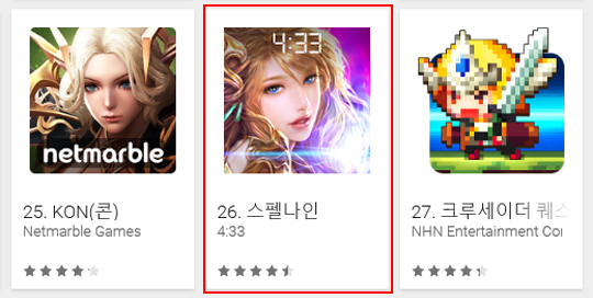 ... 게임은 지난 7일 구글과 애플에 출시된 후 8일 구글 매출 59위에서 9일 43위, 11일 31위로 서서히 상승세를 탔고 지난 주말 구글 피쳐드(구글플레이 메인에 선정되는 앱)의 영향으로 탄력을 받아 13일 26위까지 순위가 오른 것으로 분석된다. 4:33 관계자는 “스펠