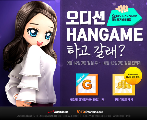 ... 오디션은 이번 한게임 채널링을 기념해 풍성한 혜택들을 유저들에게 제공한다. 한게임 오디션에처음 접속하면 경험치가 2배로 증가하는 한정판 한게임 마크가 지급되며 30일간 유지된다. 또 누구나 한게임 오디션에 최초 접속하고 캐릭터만 생성해도 최대 3만 이벤트 캐시를 받게