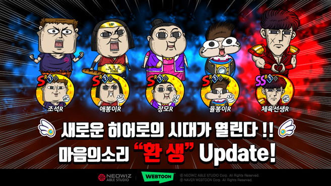 ... 환생 히어로는 ‘조석’, ‘애봉이’, ‘장모’, ‘율봉이’, ‘체육선생’ 등 총 5종이 먼저 업데이트되며, 이후 순차적으로 추가될 예정이다. 또 히어로의 빠른 성장을 위해 시나리오 모드 및 각성의 동굴 이용 시 제공되는 보상도 대폭 상향됐다. 업데이트와 함께 푸짐한 혜택을 제공하