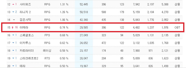 ... 아제라는 현재 경쟁작 이카루스(17위), 테라(20위), 엘로아(25위) 등을 제치고 전체 온라인게임 순위 15위를 기록하고 있다. 스마일게이트 메가포트 RPG게임사업부 이장현 사업부장은 "아제라의 선전은 쉬우면서 재미있는 PC MMORPG를 학수고대하고 있던 게이머들의