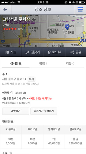 ...map. daum. net)과 앱에서 ‘종각역 주차장’, ‘코엑스 인근 주차장’ 등과 같이 목적지 인근 주차장을 검색하거나 원하는 특정 주차장 이름을 검색한 결과에 파크히어 연계 주차장이 포함돼 있을 경우 해당 주차장을 예약할 수 있다