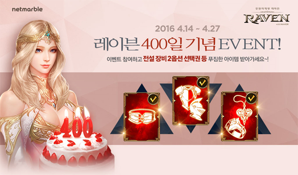 ... 이와 더불어 이용자를 위한 풍성한 혜택을 담은 기념 이벤트가 4월 27일까지 실시된다. 이벤트 기간 동안 탐험 1회 성공, 요일던전 1회 성공, 레이드 1회 성공, 길드대전 1회 도전 등 지정된 게임 내 미션을 달성하면 ‘레이븐 티켓’ 및 ‘400일 티켓’을 지급한다. 이