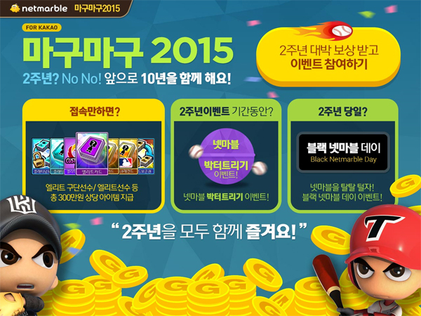 ... 넷마블은 9일 출시 2주년을 맞은 '마구마구2015'에 각종 이벤트를 마련했다. 먼저, 오는 18일 까지 접속만해도 엘리트카드, 엘리트 구단 카드 등을 포함한 푸짐한 아이템을 바로 지급하는 것은 물론 카드조합을 무한정 할 수 있는 핫타임 조합 이벤트, 마스터카드 재료를 얻을
