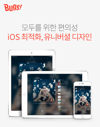 ... 이 뿐 아니라 넓은 화면에 적합한 메뉴 노출, 가로모드 지원, 어느 화면에서나 바로 재생 목록에 접근할 수 있는 미니 플레이어 등 아이패드에 최적화 된 UI(사용자 환경) 및 UX(사용자 경험)를 구성했다. 또한 ‘슈퍼사운드’로 불리는 벅스의 고음질 서비스는 물론, 개인 별
