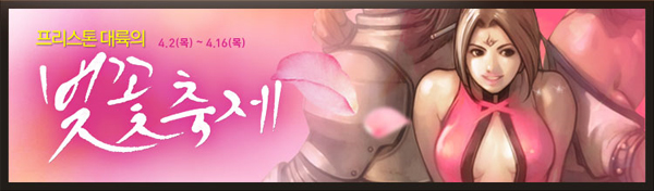 ... 벚꽃 몬스터를 사냥하면 벚꽃 링, 쉘텀류 아이템 등 다양한 이벤트 아이템 중 한 가지를 랜덤으로 획득할 수 있다. 마지막으로 스크린 샷 이벤트로 풍성한 혜택을 제공한다. 참여 방법은 홈페이지 내 스크린 샷 게시판에 벚꽃을 배경으로 하거나 클랜원들과 다정하게 사냥을 하는 모습
