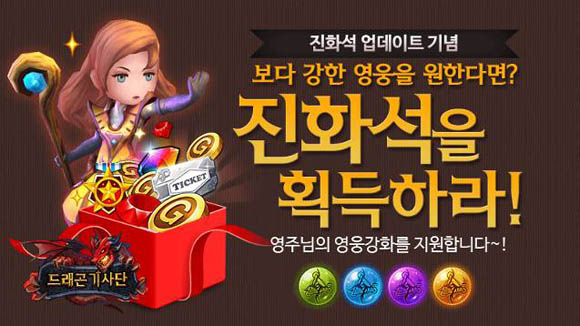 ... 이는 영웅의 전당 하단 영웅진화를 클릭해 원하는 영웅을 선택하고 필요한 진화석의 종류와 개수를 충족시키면 진행되는 형태다. 이 아이템은 던전 영웅의 탑의 보스 스테이지에서 지급되는 완료 보상으로 획득 가능하고 상점 뽑기를 통해서도 얻을 수 있다. 이와 함께 진화석 업데
