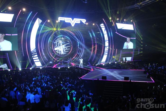 ... 피버페스티벌 첫 무대를 맡은 휘성 = 게임조선 촬영 유명 가수들의 공연으로 구성된 금일 행사에는 강호동, 최유정, 김도연이 사회를 맡고 휘성, 신유미, 위키미키, UV, 김연자, 러블리즈, 바이브, 로꼬&그레이, 승리의 순서로 공연이 진행된다. 또
