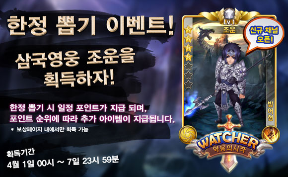 ... 또 왓쳐는 이벤트 기간 동안 일정 수정을 사용할 때마다 포인트를 증정하고, 사용 수정의 일부를 재지급하며, 일정 누적 수정 구매량을 달성할 경우에는 ‘아샤라’, ‘장비’, ‘저팔계’ 등 희귀 영웅 캐릭터까지 얻을 수 있다. 더불어 ‘한정뽑기’ 이벤트를 다시 한번 진행한다.