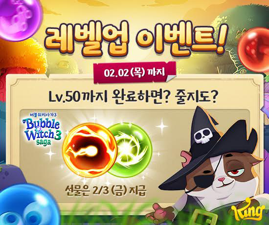 ... 50 레벨을 달성해 획득한 부스터 세트는 2월 3일 사용자들에게 일괄 지급될 예정이다. 킹 코리아의 오세욱 지사장은 “설날 연휴를 맞아 사용자들이 킹의 신작을 더욱 재밌게 즐길 수 있도록 다양한 보상 아이템을 제공하는 이벤트를 마련했다”며, “이번 이벤트를 통해 버블위치사가3와