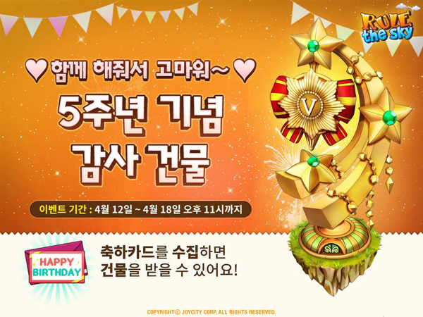 ... 이와 함께 페이스북을 통해 댓글을 작성한 유저를 대상으로 추첨을 통해 ‘커피 기프트콘’ 또는 특별 제작된 ‘컬러링북’을 증정하는 ‘5주년 축하 댓글 파티’ 이벤트를 실시한다. 또한 5주년 당일인 4월 15일 게임에 접속하는 유저 전원에게 ‘은열쇠’ 30개와 레어 건물