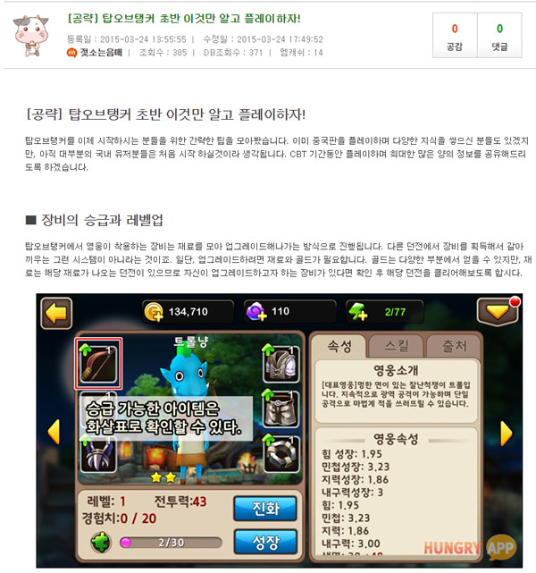 ... ‘탑오브탱크 헝그리앱’에서는 공략 정보 업데이트와 더불어 밥알 포인트 이벤트를 진행 하고 있다. 이번 이벤트는 ‘탑오브탱커 활동하고 밥알 받아가자!’와 ‘탑오브탱커 CBT 즐기고 밥알 받아가자!’ 두 가지 이벤트로 ‘탑오브탱커 헝그리앱’ 커뮤티니에서 게시글 20개, 댓글