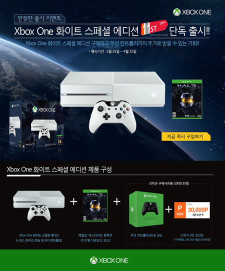 ... 또한 Xbox 브랜드관 론칭을 기념해 3월 25일부터 4월 12일까지 “Xbox One 화이트 스페셜 에디션” 구매 고객 선착순 100명에게 6만 원 상당의 블랙 무선 컨트롤러를 추가로 증정하며, 11번가 3만 포인트를 추가로 적립해주는 프로모션을 실시한다. 한국마이크로소프