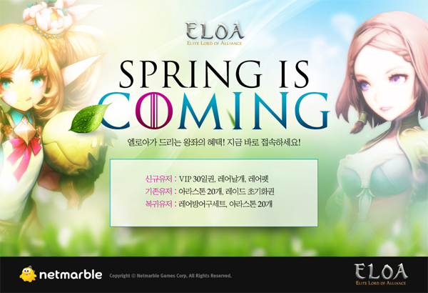 ... 또 기존 이용자에게는 아라스톤 20개, 레이드 초기화권 등 게임의 재미를 더욱 배가 시킬 수 있는 혜택을 담았다. 마지막으로 2월 28일 이후 게임에 접속하지 않은 이용자가 새로 복귀할 시 레어 방어구 세트, 아라스톤 20개 등 다양한 환영 선물을 제공한다. 넷마블 조신화