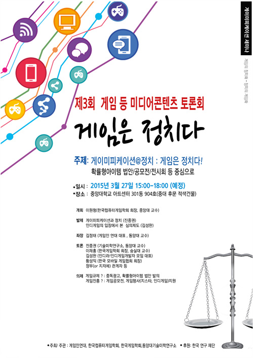 ... 토론회는 한국게임학회, 한국컴퓨터게임학회, 게임인연대, 동양대기술미학연구도가 공동 주최/주관한다. 토론회에는 진중권 동양대 교수, 김정태 게임인연대대표, 이재홍 한국게임학회 회장, 황성익 한국 모바일게임협회회장 등이 참가한다. '확률형 아이템 법안 발의', '중독광고' 등의