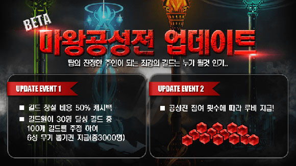 ...더불어 길드에 소속된 유저들이 길드 미션 수행으로 함께 모은 포인트를 사용하면 길드 레벨이 상승된다. 이때 생성되는 버프 포인트는 게임 플레이 시 단계별 버프 혜택 9개 중 최대 4가지를 선택해 이용할 때 활용된다. 이와 함께 ‘마왕 공성전’에서 획득한 루비로 다양한 상품을 구