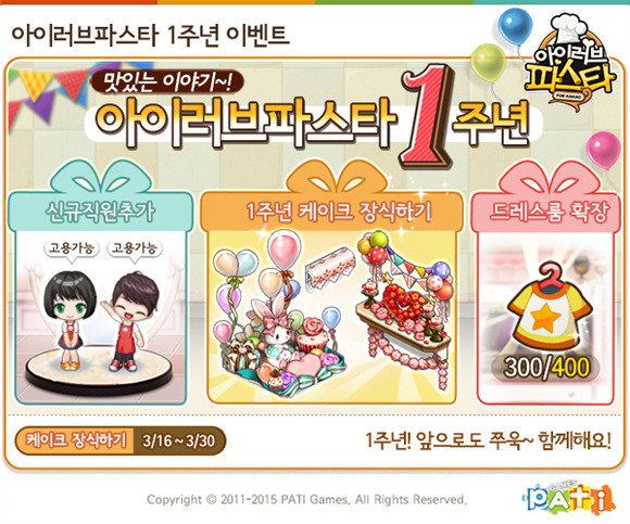 ... 8번째 직원 슬롯은 가게를 14X15까지 확장 시 소정의 캐시를 사용해 구매할 수 있다. 이와 함께 직원용 드레스 보관함이 기존 300벌에서 400벌까지 보관할 수 있도록 확장된다. 이 외에도 신규 단골손님 ‘왜그래’와 신규 3성급 와인이 총 3종 추가된다