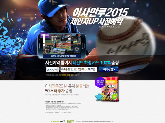... 게임빌과 공게임즈(대표 공두상)가 의기투합한 이사만루2015KBO는 풀 3D 실사 야구 게임의 독보적인 리얼리티를 보여줄 것으로 예고하고 있다. 10개 구단으로 구성될 2015년 KBO 최신 로스터는 물론 시리즈 결정판으로 불릴 만큼 각 선수들의 고유 포즈를 그대로 담아낸
