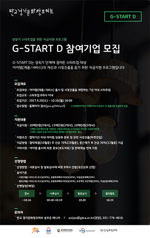 ... 참가대상은 경기도 소재 문화콘텐츠 법인(법인예정) 기업과 18년 3월까지 경기도로 사업장 이전계획이 있는 기업으로 창업 후 최소한의 기능을 갖춘 제품(MVP:Minimum Viable Product) 제작과 시장검증을 완료하고 본격적으로 제품/서비스의 출시·양산과 홍보·마케팅을