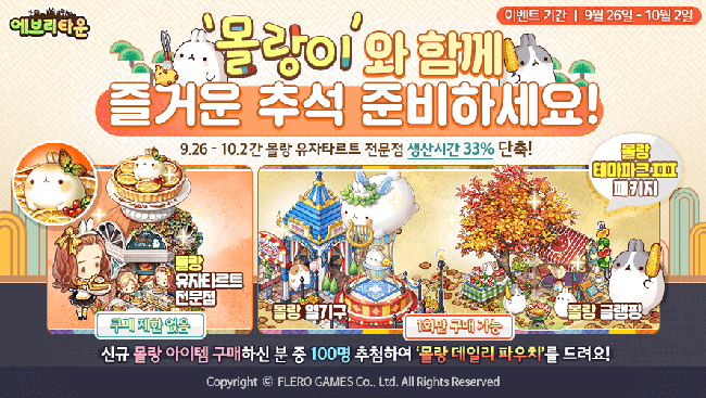 ...이와 함께 민족 대명절 추석을 기념한 ‘송편 전문점’과 이탈리아의 명절 음식으로 유명한 만두 모양의 파스타 ‘토르텔리니 전문점’ 그리고 랜드마크 ‘메이플 로드’가 업데이트 됐고 모든 타운을 대상으로 60x60 맵 확장 아이템이 추가됐다. 플레로게임즈는 내달 2일까지 ‘몰랑 유자 타