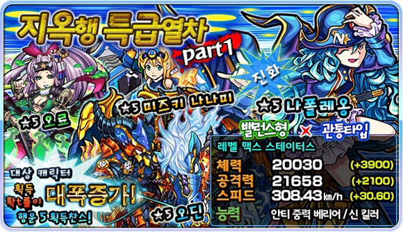 ... 공략에 성공할 경우 획득 가능한 '이자나미'는 막강한 성능을 보유한 전천후 몬스터로, 더욱 강해지고 싶은 게이머들의 열기에 불을 지폈으며, 출시 시점부터 국내 몬스터스트라이크 팬들에게 기대를 받고 있다. '이자나미'의 국내 상륙을 기념해 지옥행 특급열차 뽑기 이벤트'도 2차에