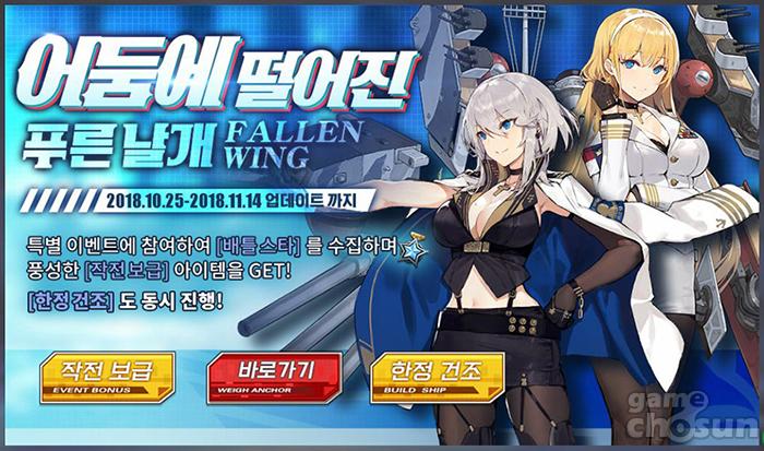 ... 업데이트 내용에는 한정 이벤트 ‘어둠에 떨어진 푸른 날개’ 를 비롯해, 이벤트에 관련된 함선소녀들과 한정 스킨 등이 업데이트 되었다. 신규 캐릭터 추가 - 한정 건조이번 한정 이벤트 ‘어둠에 떨어진 푸른 날개’를 통해 획득할 수 있는 캐릭터 중, 워싱턴, 미니애폴리스, 콜로라도,