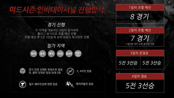 ... Tucker Civic Center)에서 4일간 펼쳐진다. 참가팀은 총 6개팀으로 한국, 북미, 유럽, 중국, 동남아시아(대만, 홍콩, 마카오)등 정규 LoL e스포츠 대회가 운영되고 있는 5개 지역의 스프링 리그 우승팀과 인터내셔널 와일드카드 인비테이셔널(Internationa