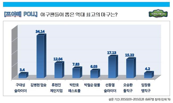 ... 후보에는 구대성의 슬라이더, 김병현의 업슛, 류현진의 체인지업, 박찬호의 패스트볼, 박철순의 팜볼, 선동열의 슬라이더, 오승환의 돌직구, 임창용의 뱀직구 등 총 8명 선수들이올랐다. 1위는 34. 14% (2,276명)의 압도적인 지지를 얻은 김병현의 업슛이 뽑혔다