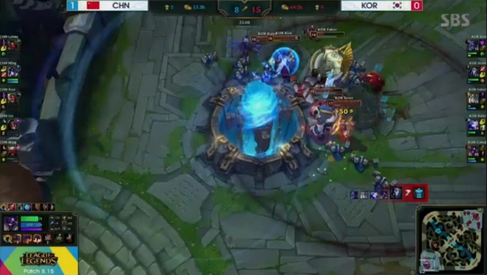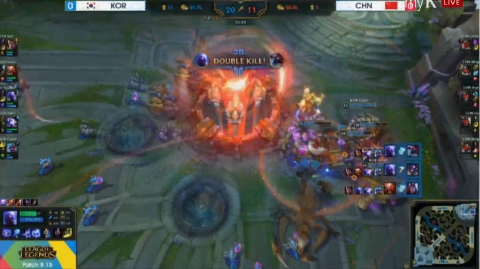...첫 경기가 시작되고 중국 대표팀은 무리하지 않으면서 한방을 노리는 모습을 보였다. 한국 대표팀도 초반에 강력한 신짜오가 등장한 만큼 크게 라인을 벗어나지 않고 있었다. 그런 상태라 경기 시작 5분경 바텀(하단) 라인에 고동빈의 그라가스가 갱킹으로 라칸의 체력을 크게 깎아냈던 것