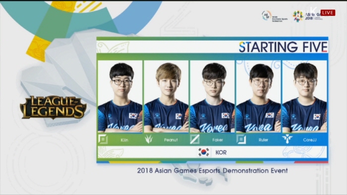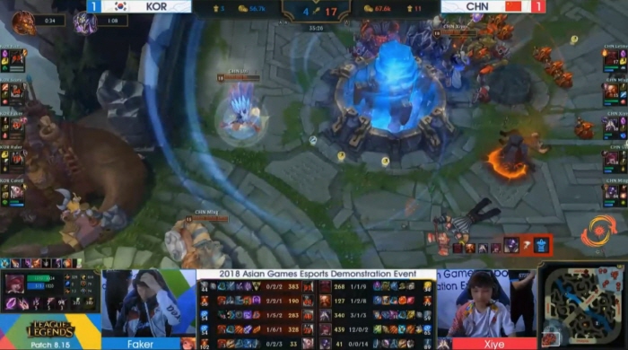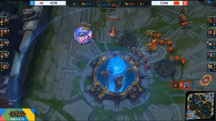 ...중국 대표팀은 옌전쭤(렛미)-나르, 류시위(엠엘엑스지)-리신, 쑤한웨이(시예)-갈리오, 지안즈하오(유지아이)-자야, 시썬밍(밍)-그라가스를 선택하고 아트록스, 케인, 벨코즈, 트런들, 킨드레드를 벤픽했다. 퍼스트 킬은 5분 경 한국 대표팀이 가져갔다. 바텀(하단)에서 리신이 철수