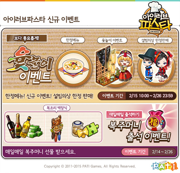 ... 또한, 유저는 신규 메뉴로 떡국을 2월 16일부터 26일까지 한정 판매할 수 있다. 떡국 메뉴를 손님에게 판매할 경우 윷놀이에 필요한 윷가락을 더 높은 확률로 획득할 수 있다. 이와 함께 같은 기간 동안 출석하는 모든 유저에게 매일 1회씩 복조리, 캐시, 와인, 파스타 등
