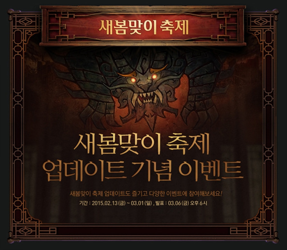 ... 이와 함께 봄을 기리는 의미에서 추가된 ‘새봄맞이 축제’는 막강한 힘을 소유한 봄의 괴수를 길들인다는 설정의 모드로, 봄의 괴수와 함께 상대 진영을 점령 하는 것이 최종 목표다. 봄의 괴수와 함께 승리하면 새로운 로딩 화면 ‘고대의 음률’, ‘붉은뿔 짐꾼’, ‘비취뿔 짐꾼’