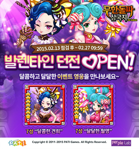 ... 공략에 성공할 시 참여자에게 보상이 주어지며 가장 높은 데미지를 입힌 길드원에게는 추가 보상이 주어진다. 또한, 발렌타인을 기념한 전용 던전이 2월 13일부터 27일까지 공개된다. 이벤트 던전에서는 ‘달콤한 견희’, ‘달달한 월영’ 등 한정 영웅과 ‘사랑의 초콜릿’을 획득할
