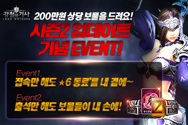 ... ‘'강철의기사'를 꾸준히 이용해온 유저라면 오는 2월 28일까지 게임 접속 시 해당 아이템을 받을 수 있다. 또한, 같은 기간 동안 매일 게임에 출석한 유저들에겐 ‘5성 동맹 동료’ 및 ‘4성 영웅장비’ 등 고급아이템을 보상으로 제공한다. 이외에도 2월 12일부터 2월