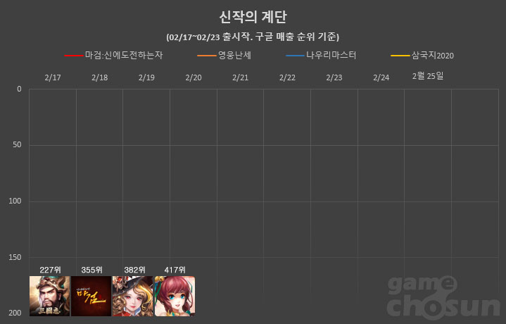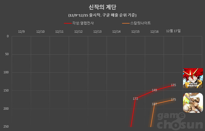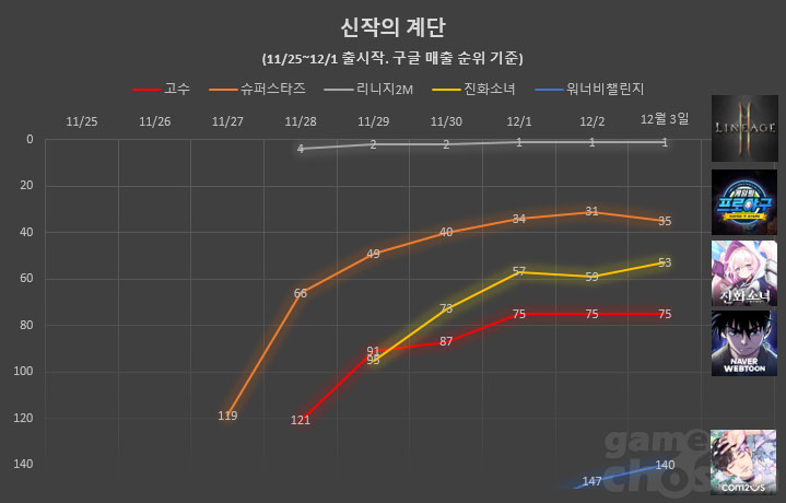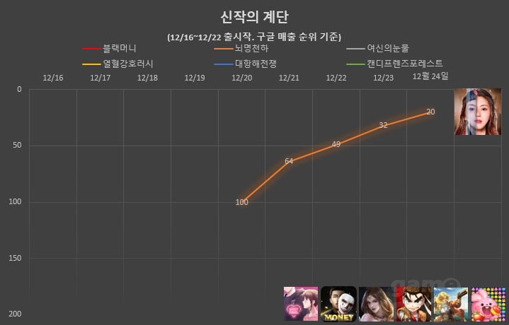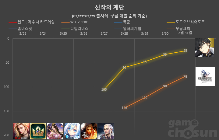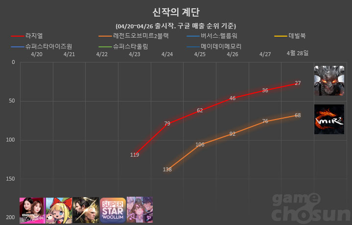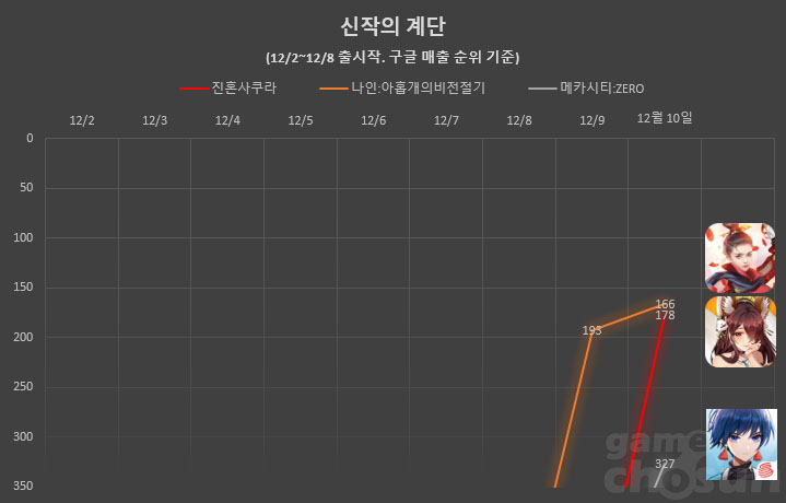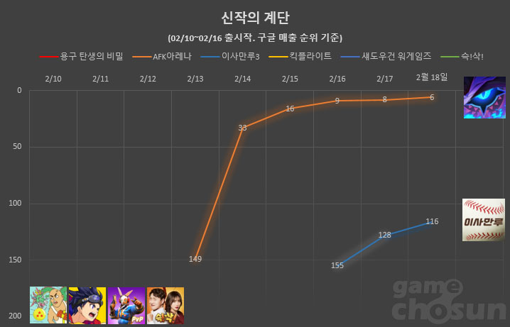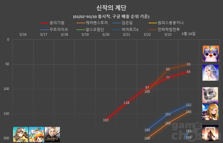 ... 여기에 스토어 각종 집계 순위 어느 곳까지 올라서느냐에 따라 흥행 성적이 크게 좌우되기도 한다. 안 아픈 손가락이 없다는 게임사가 애달픈 심정으로 보내게 되는 오픈 첫 주. '신작의 계단' 코너를 통해 지난 한주 간 출시된 주요 신작들의 첫 주말 성적을 알