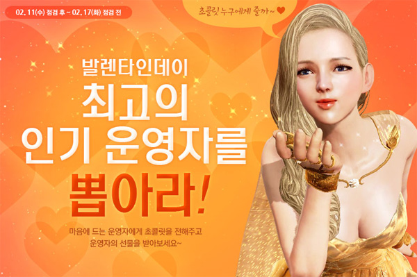 ... 4명의 게임운영자는 1등으로 선정됐을 경우 특별 이벤트를 진행하고 투표한 플레이어들에게 추가 아이템을 지급하겠다는 등의 각기 다른 공약을 내세우고 있다. 김정하 ‘아키에이지’ 사업팀장은 "좋아하는 사람에게 초콜릿을 주는 발렌타인데이를 보다 재미있게 즐길 수 있도록 운영자 인