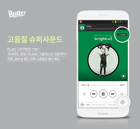 ... 보유 중인 FLAC 음원은 80만 곡으로, 타사 대비 압도적인 수치를 자랑한다. 와이파이(Wi-Fi) 환경을 통해 DLNA(Digital Living Network Alliance) 기기를 벅스 앱과 연결하는 기능도 이번 업데이트에서 추가됐다. 이 기능을 이용하면 벅스 앱