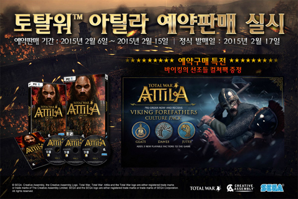 ... 이번 예약 구매자에게는 '토탈워: 아틸라'의 첫번째 DLC인 '바이킹의 선조들' 컬쳐팩을 무료로 제공한다. 본 DLC는 고유의 영토, 해군 유닛, 미션, 문화 특성을 가진 예어트, 데인, 주트 세 개의 북유럽 팩션을 포함한다. '토탈워: 아틸라'는 오는 17일 정식 발