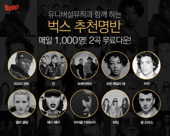 ... 추천 곡과 함께 앨범 단위의 소개가 진행되며, 음악 견문을 넓힐 수 있도록 심도 있는 명반 리뷰가 포함되는 것이 특징이다. 벅스는 유니버설뮤직과 함께 오는 13일까지 열흘 간 추천되는 샘 스미스(Sam Smith), 50센트(50Cent), 킨(Keane), 코린 베일리 래(