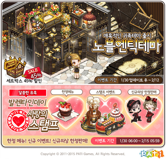 ... 이 메뉴는 ‘행복나눔장터’에서 재료를 획득해 제작할 수 있다. 뿐만 아니라 각종 이벤트도 동시에 진행된다. ‘발렌타인데이 이벤트’에서는 특별 미션을 달성하면 지급되는 스탬프를 모으면 ‘발렌타인 초콜릿 퐁듀분수’를 비롯한 발렌타인데이 기념 아이템을 지급한다