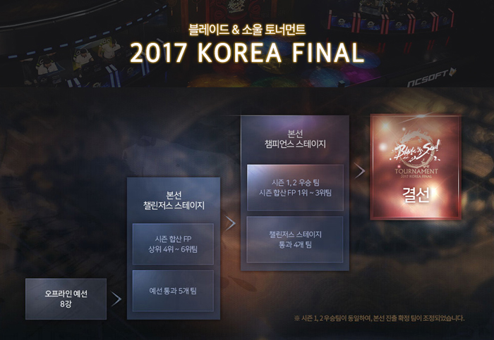 ... 월드 챔피언십은 9월에 열린다. 한국 대표로는 3팀(코리아 파이널 우승/준우승팀, 와일드 카드전 우승팀)이 참여한다. 엔씨소프트는 코리아 파이널에 예선전을 도입하여 이용자의 참여 기회를 넓혔다