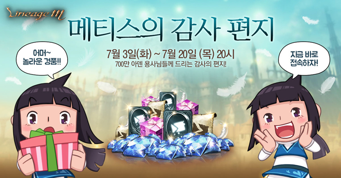 ... 아이템은 게임내 우편함으로 지급된다. 리니지M은 출시 이후 12일 만에 누적 가입자 700만명을 기록했다. 최고 일간이용자수(DAU, Daily Active Users)는 출시 당일인 6월 21일에 210만명이다