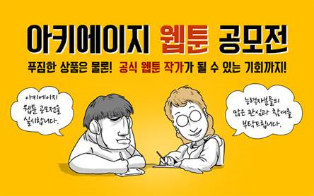 ... 1위로 선정된 2명에게는 ‘아키에이지’ 기념품과 게임머니(루루)를 제공하고 3월 중순부터 12월까지 ‘아키에이지’ 공식 홈페이지에 마련될 예정인 별도 게시판에서 ‘아키웹툰작가’ 칭호를 부여 받아 작품을 연재할 수 있다. 김정하 ‘아키에이지’ 사업팀장은 "아키에이지 게임 내에서