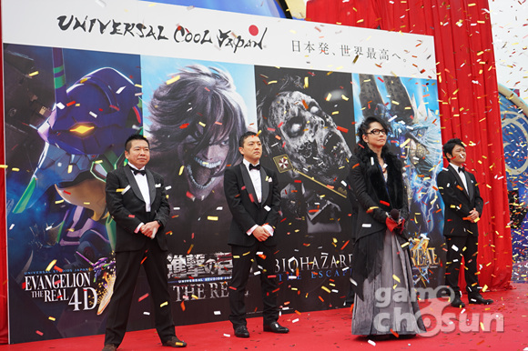 ... 개막식에는 각 어트랙션의 원작 제작에 참여한 업체 관계자들과 '유니버설 쿨 재팬'의 공식 홍보모델 연예인 '하이도'(남성)가 참가해서 인사말을 전했다. '진격의거인' 애니메이션 버전의 와다 죠지 프로듀서, '에반게리온' 극장판 오오츠키 토시미치 프로듀서, '바이오