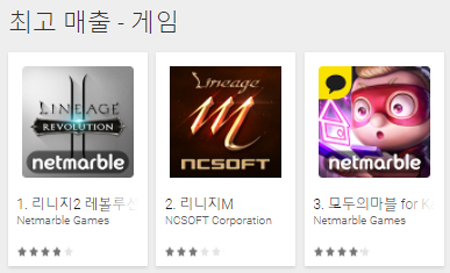 ... 구글플레이의 경우 실시간 매출을 반영하는 것이 아닌 3~4일 간의 매출을 평균낸다고 알려져 있다. 이에 전문가들은 "리니지M의 구글매출 1위 달성은 시간문제"라고 평하고 있다. '리니지M'은 리니지 원작사 엔씨소프트가 개발한 모바일 MMORPG(다중접속역할수행게