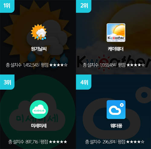 ... 최근 미세먼지 '나쁨'이 이어지고 있는 가운데 미세먼지/날씨 앱 순위는 총 설치수 기준으로 1위 원기날씨, 2위 케이웨더, 3위 미세미세, 4위 웨더퐁 순으로 나타났다. 총 설치수 145만으로 1위를 차지한 원기날씨는 날씨와 미세먼지 등을 직관적으로 한눈에 볼 수