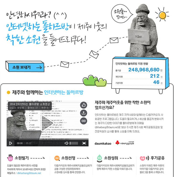 ... 도움이 필요한 개인이나 단체가 이메일을 통해서 신청하면 다음과 제주공동모금회가 공동 구성한 선정위원회에서 심사를 통해 후원 대상자를 선정하게 되며 심사결과는 2월 3주차에 발표할 예정이다. 신청서 양식 등 자세한 내용은 인터넷하는돌하르방 홈페이지에서 확인이 가능하다. 20