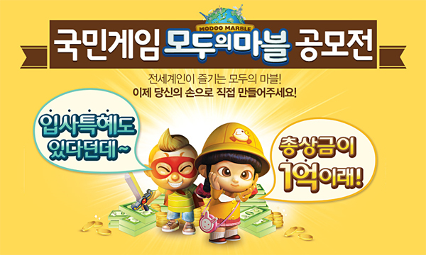 ... 공모전 주제는 '게임기획부문'(신규맵, 콘텐츠, 사업 모델)과 실제 활용 가능한 '아이디어부문'(업데이트, 이벤트, 마케팅) 등 총 2가지다. 참여를 원하는 이용자는 오는 2월 13일까지 ‘모두의마블’ 공모전 접수 페이지를 통해 응모할 수 있다. 1차 포트폴리오 심사 통과자