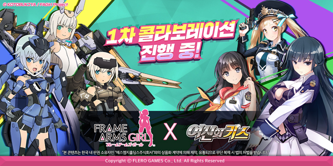 ...이번 1차 콜라보레이션으로 ‘프레임암즈걸’ 캐릭터 3종(고우라이, 스틸렛, 바제랄드)이 게임 내 신규 캐릭터로 등장했다. 콜라보레이션 캐릭터를 더욱 강하게 만드는 컬렉션 아이템도 업데이트 됐으며 이는 게임 플레이 중 드롭되는 전용 아이템을 모아 교환할 수 있다. 회사 측은 이번