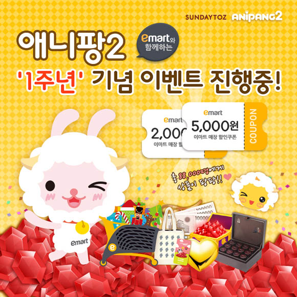 ... 1주년 감사 이벤트로 2월 4일까지 매일 매일 응모 가능한 이마트 할인권 찬스가 진행되어 총 88,000명에게 이마트 할인권을 증정할 예정이다. 또한 이마트 앱에서는 이마트 앱에 숨은 루비를 찾아라 이벤트가 진행되며 오늘의 운세를 통해 최대 루비 1,000개, 단골 이마트