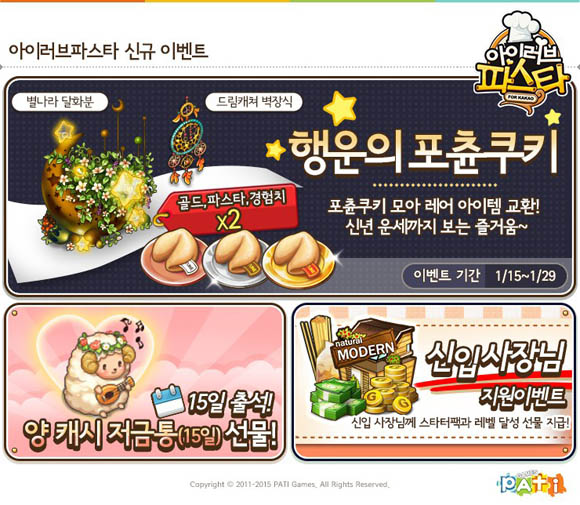 ... 이달 29일까지 아이러브파스타 for Kakao를 다운로드 받아 실행하는 모든 신규 유저들은 10만골드와 20캐시, 내추럴모던 세트 등 파격적인 혜택으로 구성된 스타터팩을 지급받을 수 있으며 일정 레벨 달성 시 캐시를 추가로 획득할 수 있다. 또한 15일부터 29일까지 15일